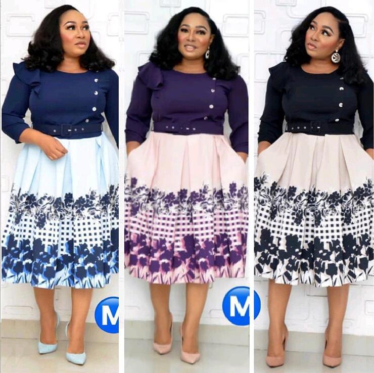 Autumn New Style African Plus Size Women's Round Neck, Three-Quarter Sleeves, Large Print Stitching Pocket Dress